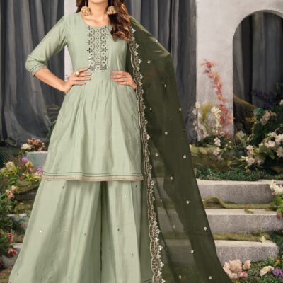 DR Kurti Hub – Sage Green Hand-Embroidered Sharara Set