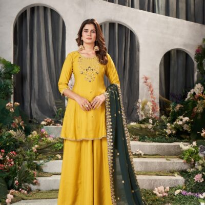 DR Kurti Hub – Mustard Gold Hand-Embroidered Suit Set