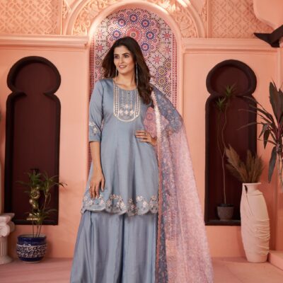 DR Kurti Hub – Elegant Grey & Pink Embroidered Suit Set