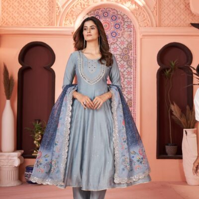 DR Kurti Hub – Elegant Greyish Blue Anarkali Suit