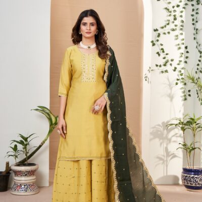 DR Kurti Hub – Mustard and Green Embroidered Kurta Set with Dupatta