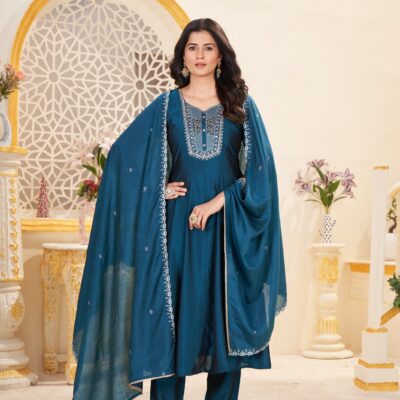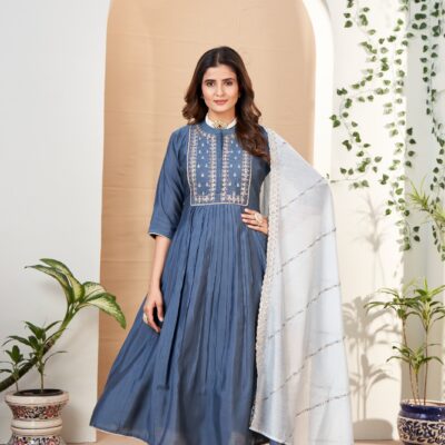 DR Kurti Hub – Elegant Blue Anarkali Set with Embroidered Dupatta