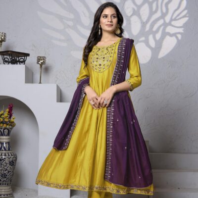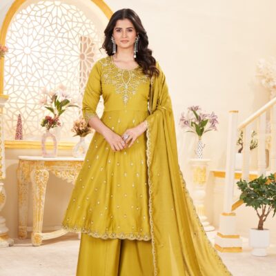 DR Kurti Hub – Mustard Yellow Embroidered Anarkali Palazzo Set